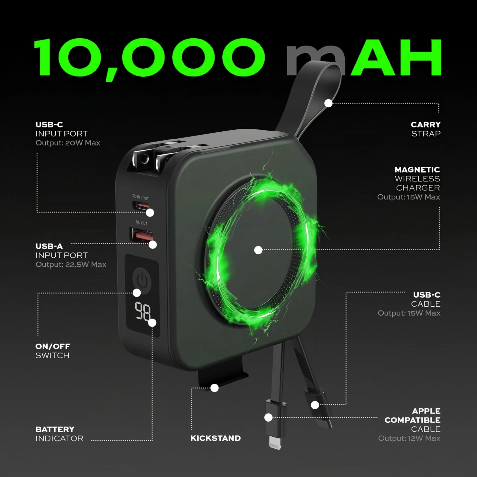 - Integrated Cables: Built-in Lightning and USB-C cables for tangle-free charging